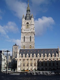 Questo è il Beffroi di Gand in una foto ufficiale scattata con un grandangolare sullo sfondo di un cielo quasi sereno